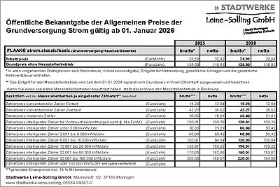 Öffentliche Bekanntgabe der Allgemeinen Preise der Grundversorgung Strom ab 01. Januar 2026.