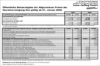 Öffentliche Bekanntgabe der Allgemeinen Preise der Grundversorgung Gas ab 01. Januar 2026.